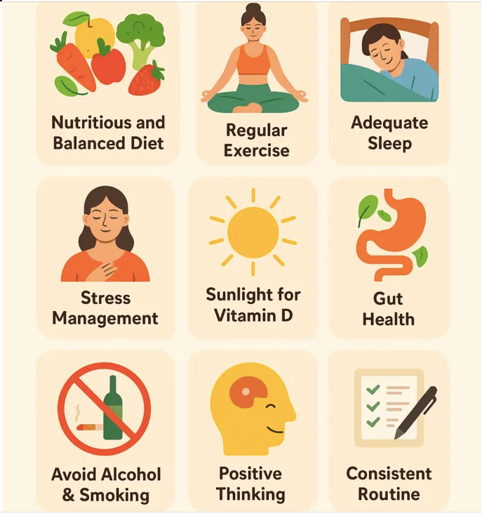 Keeping your immunity strong is essential for staying healthy and energetic. Eating a balanced diet with fruits, vegetables, nuts, and proteins, along with regular exercise, can boost your immune system. Getting enough sleep, managing stress through meditation, and staying hydrated are equally important. Vitamins like C and D, minerals like zinc, and natural remedies such as ginger, turmeric, and garlic support your body’s defenses. Avoiding smoking and excessive alcohol, spending time in fresh air, and practicing good hygiene further protect you from illnesses. From personal experience, following these simple habits not only helps prevent sickness but also keeps you feeling more energetic and resilient every day.